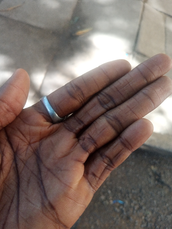 In the city of Unknown, Unknown, a close-up image depicts the open palm of a dark-skinned human left hand, oriented with fingers extending towards the top right. A plain, silver-colored metallic band-style ring is worn on the ring finger. Distinct creases are visible across the palm and along the finger joints. The background is heavily blurred, displaying indistinct patches of light and dark gray, brown, and off-white, consistent with an outdoor paved or concrete surface under natural light, with a small, blurry blue object visible in the lower right. No specific actions or interactions are evident beyond the presence of the hand and ring.