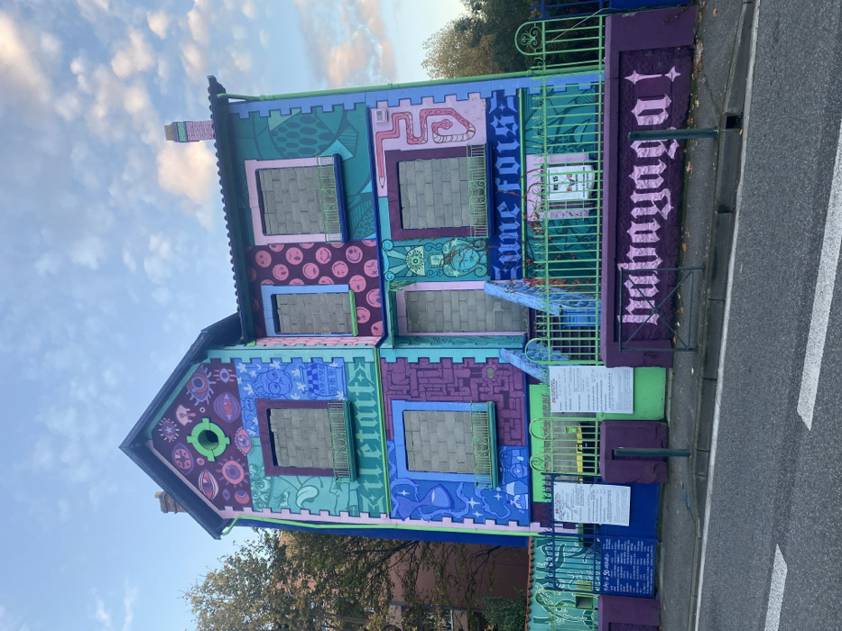 A two-story building with an attic, located at 171 Avenue Jean Rieux, 31400 Toulouse, France, is depicted from a street-level perspective under a partly cloudy blue sky. The entire exterior of the house is covered in vibrant, multi-colored murals featuring abstract patterns, stylized eyes, faces, an hourglass, a snake, and a fish-like motif. Predominant colors include various shades of blue, purple, green, and pink. All visible windows on the first and second floors, as well as the main entrance, are boarded up with light gray concrete blocks. Green metal balustrades are present below the upper-floor windows. Black roof tiles cover the gabled roof, and a red-painted chimney is visible on the right side. A green metal fence with decorative scrollwork runs across the front of the property, behind a low purple concrete wall. Several white rectangular posters with black text are affixed to the fence and a green metal gate. The fence's base features a mural with stylized eyes and other designs. On the purple wall, beneath the fence, the word "babayaga!" is painted in light pink gothic script. In the immediate foreground, a dark asphalt road with white dashed lane markings is visible, bordered by a gray concrete sidewalk. Trees with green and autumnal foliage are visible behind and to the left of the house. No individuals are present in the frame.