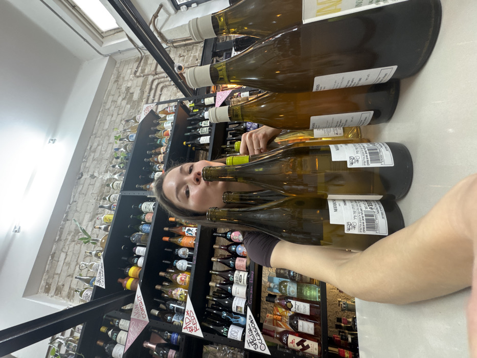 The image depicts the interior of a wine shop in Tel-Aviv, Israel