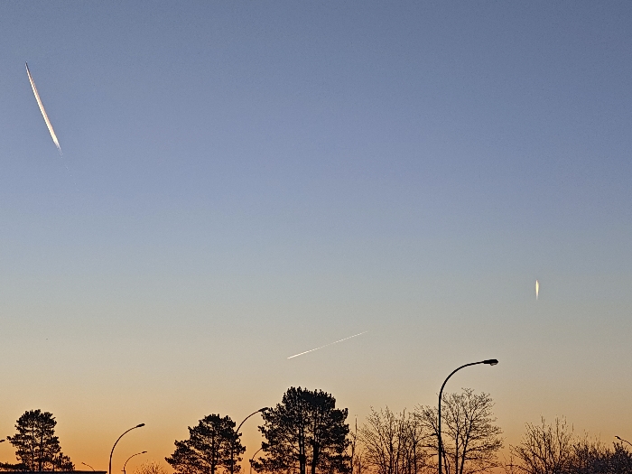 The scene depicts an outdoor environment in Leudelange, Luxembourg, under atmospheric conditions consistent with either sunrise or sunset. The sky transitions from a light blue in the upper portion to an orange-yellow hue along the horizon. Two linear contrails are present; one is a prominent, brightly illuminated white streak extending diagonally downwards from the upper-left quadrant, and a second, finer white streak traverses horizontally across the mid-sky, positioned above the tree line. A distinct, vertical, elongated bright light streak or reflection is visible in the mid-right sky. The lower foreground is characterized by the dark silhouettes of several trees, including both dense coniferous varieties and deciduous trees with bare branches. Multiple dark, curved streetlights, consistent with municipal infrastructure, are also silhouetted against the illuminated horizon. No individuals or identifiable man-made structures beyond the streetlights and trees are discernible.