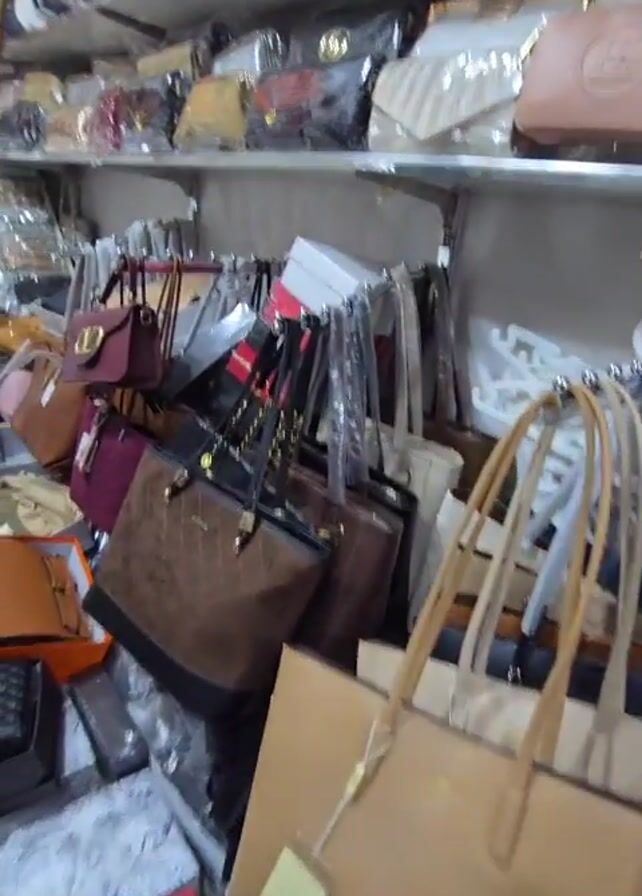 shop with a variety of handbags on display. The shelves are lined with different styles, colors, and brands of handbags, ranging from small clutches to large totes. Some bags are hanging, while others are arranged on the shelves. Several shoe boxes are stacked on the floor. The shop appears to be well-stocked and may be a wholesale or retail store selling handbags.