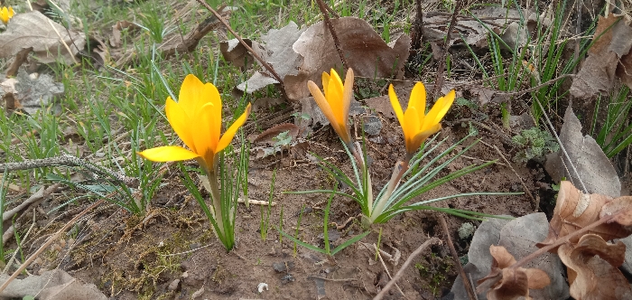 - "A ground-level photograph depicts three yellow crocus flowers blooming in the city of Charshanba, Uzbekistan" by FM-hRTV63, licensed under CC BY 4.0