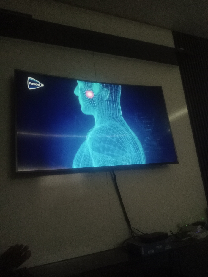 A television screen displays an advertisement for Panadol. The ad features a blue, wireframe depiction of the human body. A red spot on the head highlights an area of pain. Cables run from the television down the wall to a box and other electronic equipment on a dark surface. Part of a foot is visible in the lower left corner of the image.