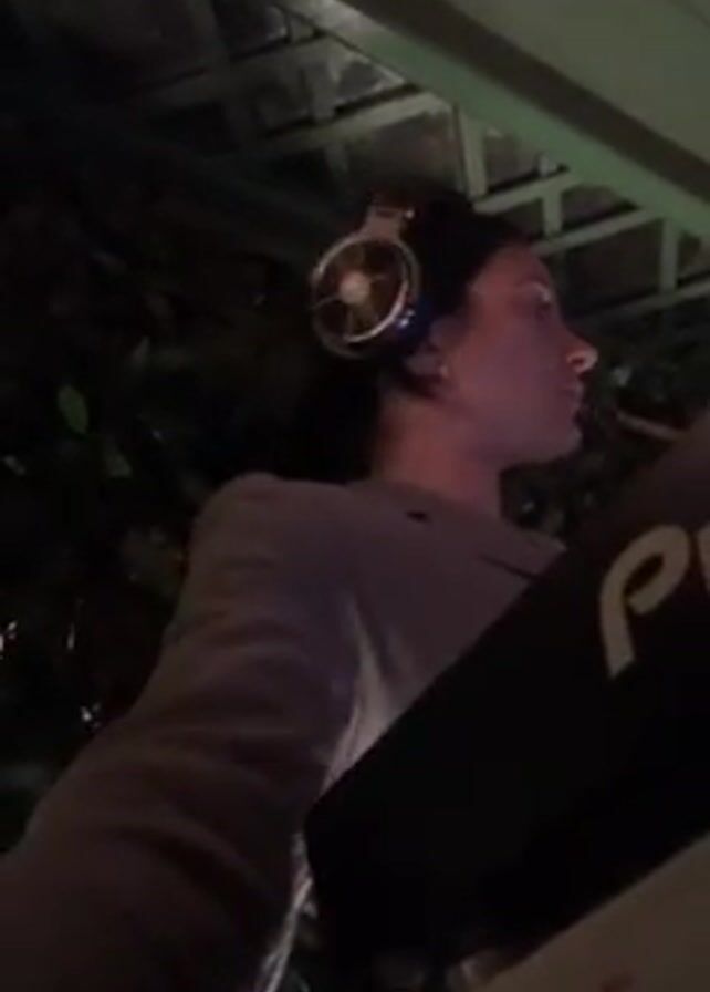 A low-angle medium shot shows a woman DJing at an event with a black Pioneer soundboard in front of her. The woman is wearing a grey blazer and black headphones. Her hair is pulled back. The background is green, suggesting an outdoor event with foliage. The overhead lighting is low. The camera appears to be held at an angle, looking up at the DJ.