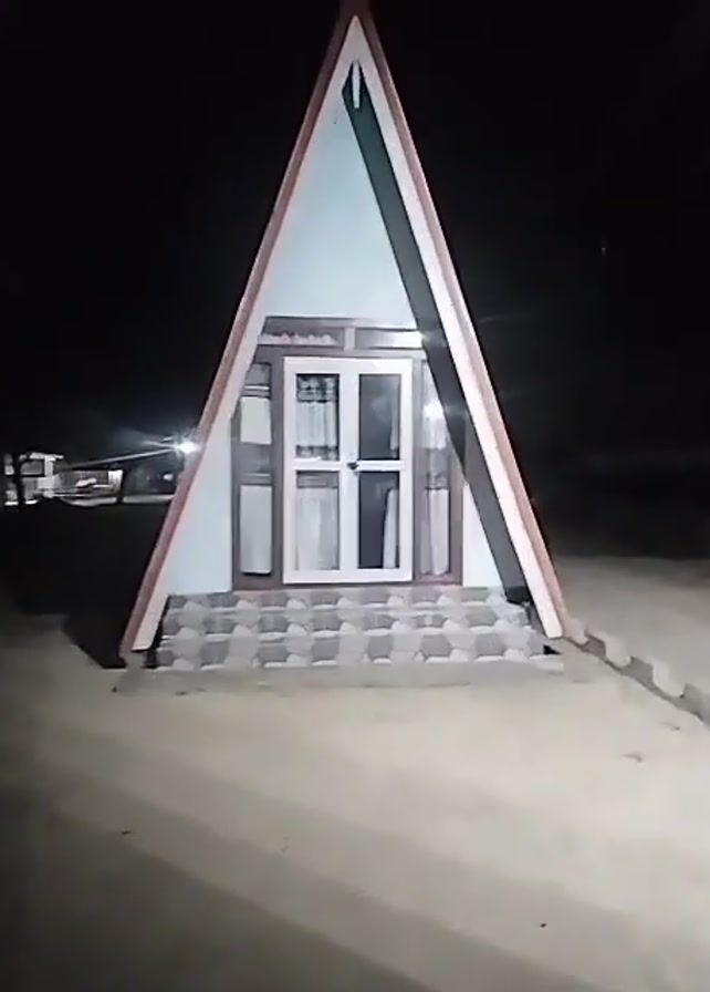 triangular-shaped house at night. The house has a white and light blue exterior with a brown trim. There is a white door in the center, with two white curtains visible through the glass. There are also a few steps leading up to the door, made of grey tiles. The surrounding ground appears to be sandy. The background is completely dark, except for a few lights in the distance to the left. The camera remains mostly static during the video.