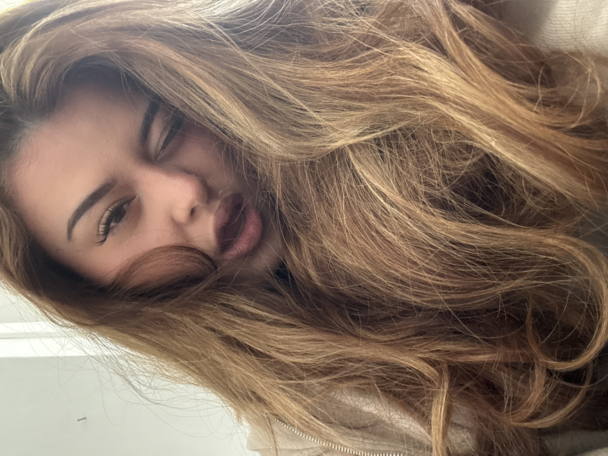 A close-up, slightly angled shot of a young woman with light brown hair that partially covers her face