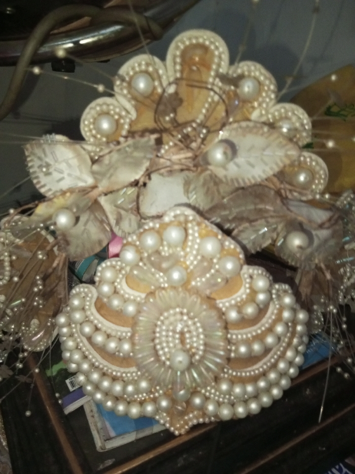 An elaborate, decorative hair accessory dominates the scene. It consists of pearl-studded, stylized shapes, possibly flowers or leaves, layered and intertwined. A fan-like arrangement sits atop a similar, broader base, both adorned with concentric rows of pearls. The overall color palette is soft, featuring creams, whites, and light browns. Delicately wired pearl accents extend outwards, adding to the complexity of the design. The piece rests on a surface cluttered with miscellaneous items.