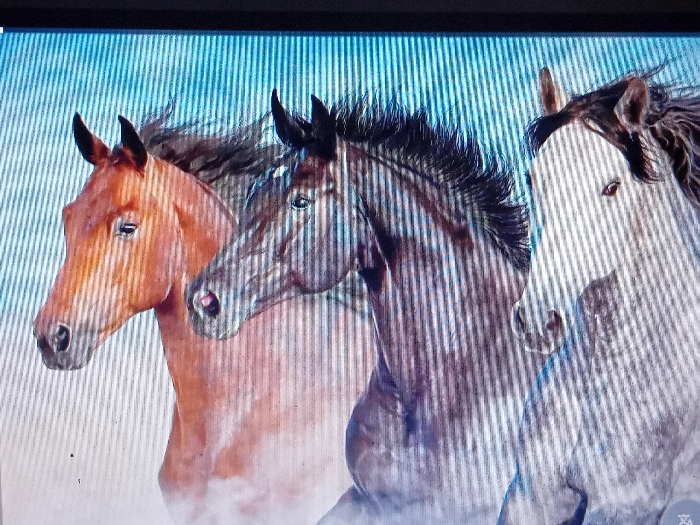 - "A digital image, exhibiting vertical scan lines indicative of a screen display, depicts three horses in profile, moving from left to right" by FM-Nkx5y1, licensed under CC BY 4.0