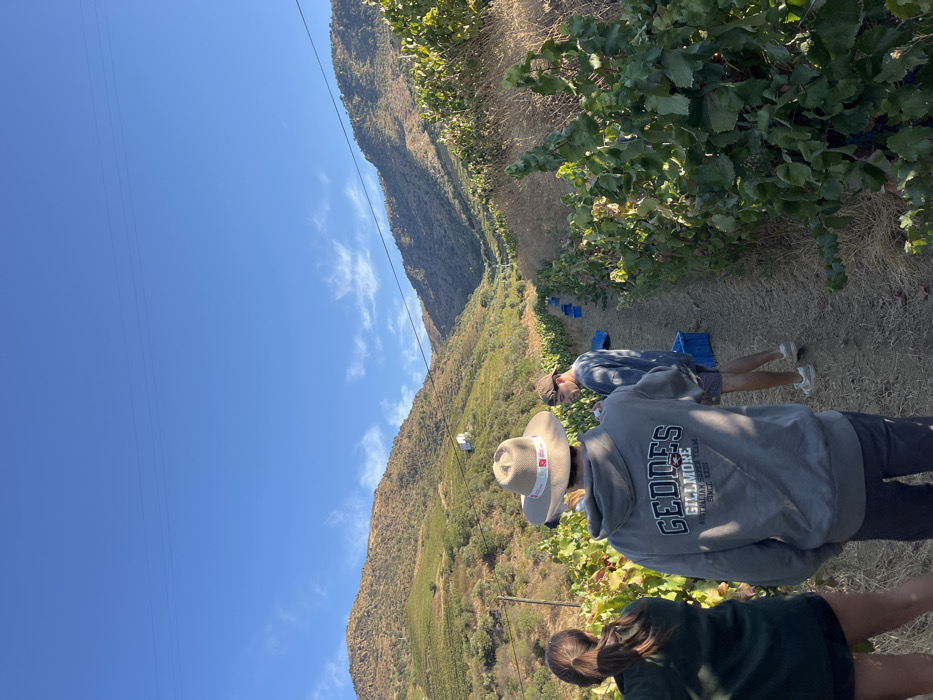 The image presents a sunlit vineyard scene in Carrazeda de Ansiães, Portugal. Three individuals are positioned in the foreground and mid-ground, observed primarily from behind. The person on the far left has dark hair and wears a dark garment. The central figure wears a light-colored straw hat with a red and white band, along with a grey hooded sweatshirt displaying "GEDDES GILLMORE AUSTRALIAN SKI TEAM" on the back. To their right, a third person, with short dark hair, wears a light blue long-sleeved shirt, patterned shorts, and white athletic shoes, appearing to look downwards or towards the vines. The immediate environment consists of rows of grapevines with vibrant green leaves and visible clusters of dark grapes. A dirt path separates the vine rows, and several blue plastic crates are scattered along the path and within the vineyard, suggesting grape harvesting activity. The background is dominated by a series of steep, terraced hillsides covered with extensive vineyards and areas of dry, scrubby vegetation. A small, white structure is visible on a distant hillside. The sky above is clear and blue with sparse, wispy white clouds. Two thin, dark power lines are visible horizontally in the upper portion of the sky. The overall lighting indicates a clear day.