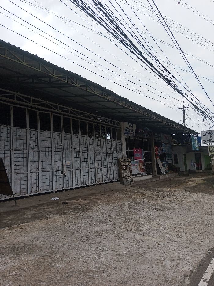 A long, closed storefront with multiple gray metal doors beneath a large metal awning dominates the left side. Various advertisements and signs are visible near the store's entrance. A smaller building with a white exterior sits adjacent to the store. Numerous overhead electrical wires crisscross the sky. The ground in front is a mix of paved and unpaved surfaces, lightly strewn with debris. The sky is overcast.