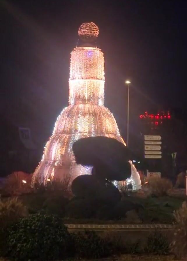 At night, a tall, illuminated structure stands in the center of a traffic roundabout. The structure appears to be constructed from a series of stacked, cylindrical components, creating a shape reminiscent of a dress or a stylized bottle. It is brightly lit with a mix of white and colored lights. In the foreground, a manicured shrubbery with dense, dark green foliage surrounds the base of the structure. A car can be seen momentarily driving around the roundabout. In the background, a street lamp illuminates the area, and a signpost with directional information is visible. The overall ambiance is festive, with the illuminated structure serving as a prominent landmark.