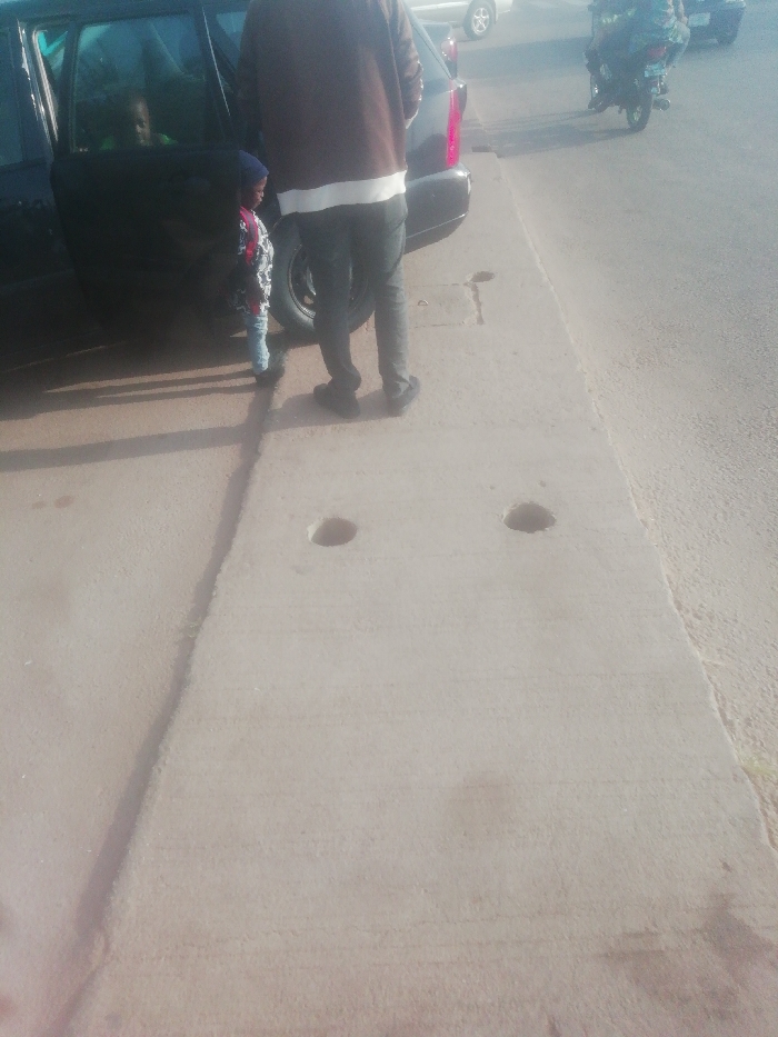 A black car with an open door stands on the side of the road. A child in colorful clothing stands near the door, seemingly getting in or out. An adult stands beside the child, facing away from the camera, wearing a brown sweatshirt and gray pants. A motorcycle passes in the background. The foreground features a concrete slab with two circular holes. The scene is bathed in bright daylight.