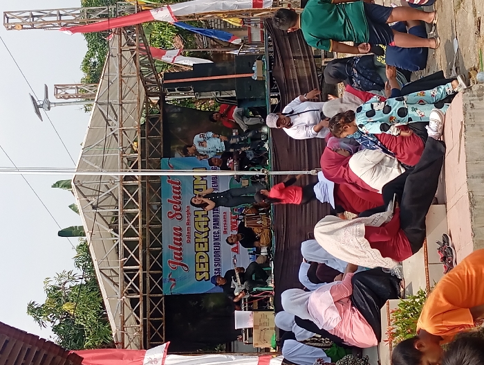 An outdoor community event is depicted in Sidorejo, Indonesia, featuring a temporary stage and an audience