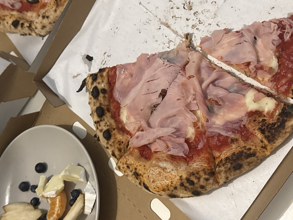 The image presents an overhead view of food items arranged on a light-colored surface, likely a table. In the foreground, a significant portion of a Neapolitan-style pizza occupies a brown cardboard box lined with white parchment paper. The pizza features a thick, charred crust (cornicione) with prominent leopard spotting, a layer of red tomato sauce, melted white cheese, and a generous topping of thinly sliced pink ham. The pizza is partially consumed, with one triangular slice detached and a visible gap where another slice was removed. Crumbs and minor food debris are scattered on the parchment paper. In the upper left quadrant, a light gray or white ceramic plate holds an assortment of fresh fruits and cheese. Visible items include several dark blueberries, segments of a bright orange tangerine, and multiple irregularly shaped slices of white brie cheese, some still with rind. Also present are slender, pale yellow slices of what appear to be pear or apple. In the upper right background, another partially visible pizza, also Neapolitan-style, rests in an open cardboard box, suggesting multiple pizzas are present. The overall scene indicates a casual meal setting, likely involving takeout or delivery. No individuals are visible in the frame. The specific location within Warsaw, Poland, is not discernible from the visual evidence presented in the image.