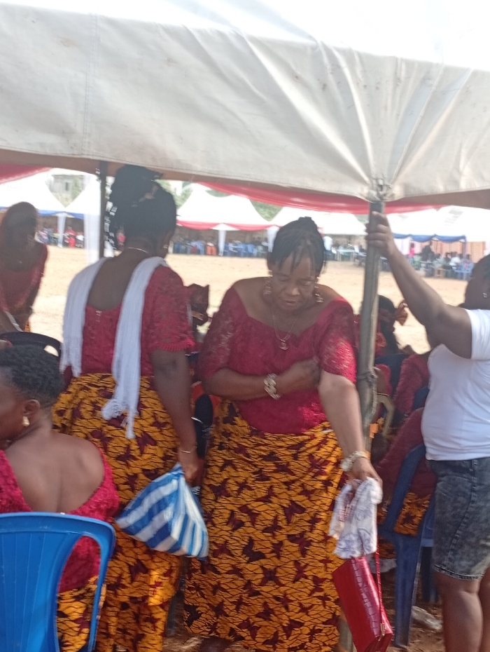The scene depicts an outdoor gathering occurring under a large white canopy tent in Nkwelle, Nigeria