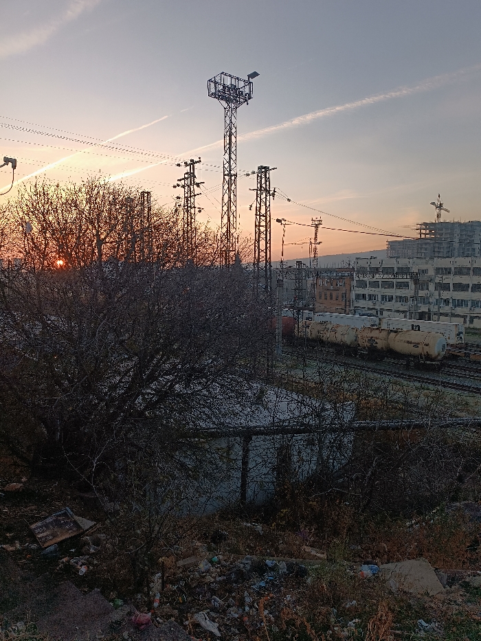 An industrial landscape at sunrise features bare trees and overgrown vegetation in the foreground, leading to a chain-link fenced structure and railroad tracks with tank cars. Power lines stretch across the sky, crisscrossed by airplane contrails. Tall metal towers and electricity pylons dot the horizon, alongside a multi-story building under construction with a crane. The background reveals a complex of buildings, illuminated by the rising sun. Rubbish litters the ground in the immediate foreground.