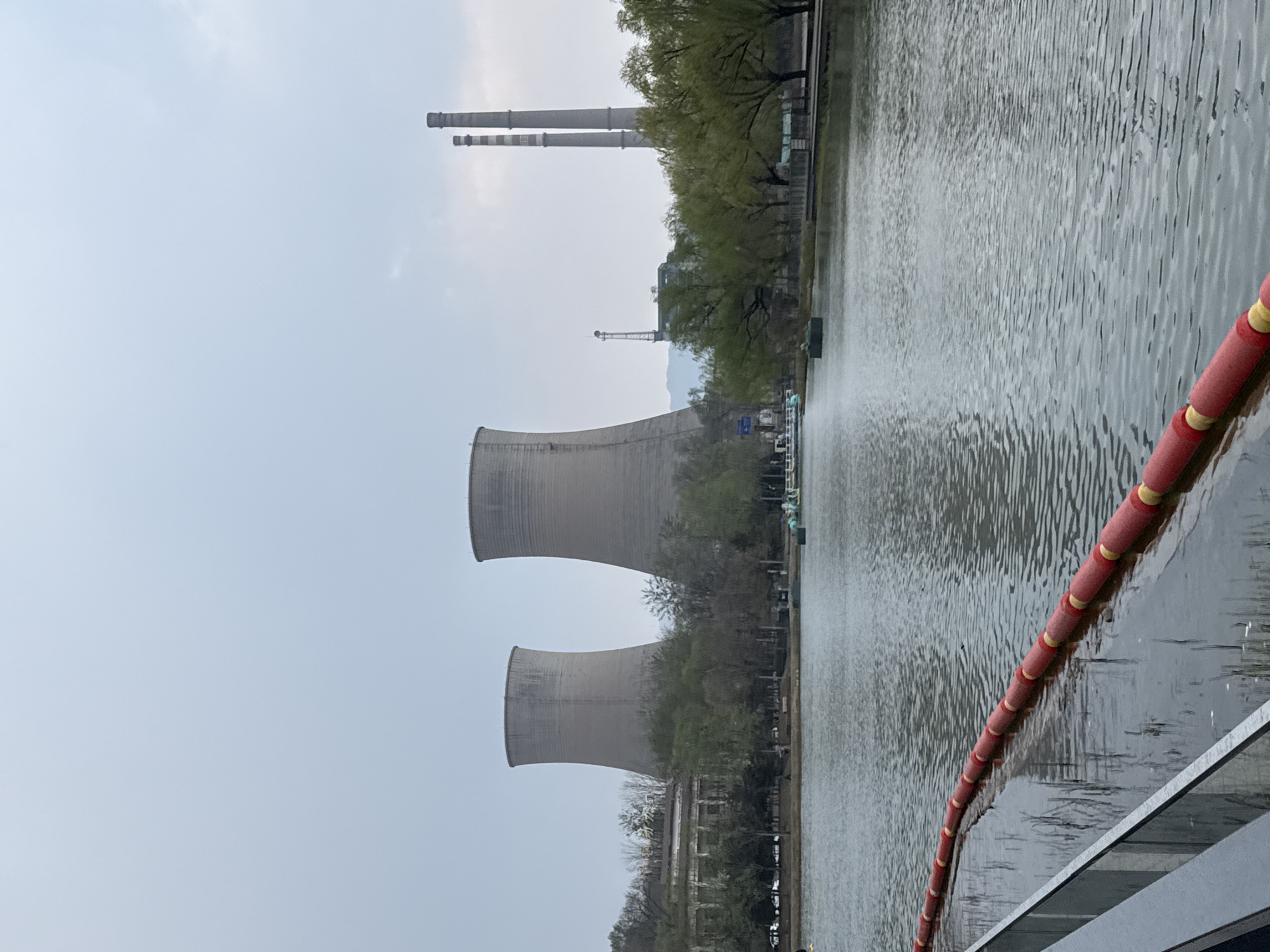 The scene shows a view of the Shougang Industrial Park in the Shijingshan District of Beijing, China. The foreground features a body of water with a red and yellow flotation barrier along a metallic structure. In the distance, two large cooling towers and two smokestacks are visible, indicating an industrial complex. Trees are interspersed throughout the scene, and the sky is overcast. There are no visible people or explicit actions taking place.