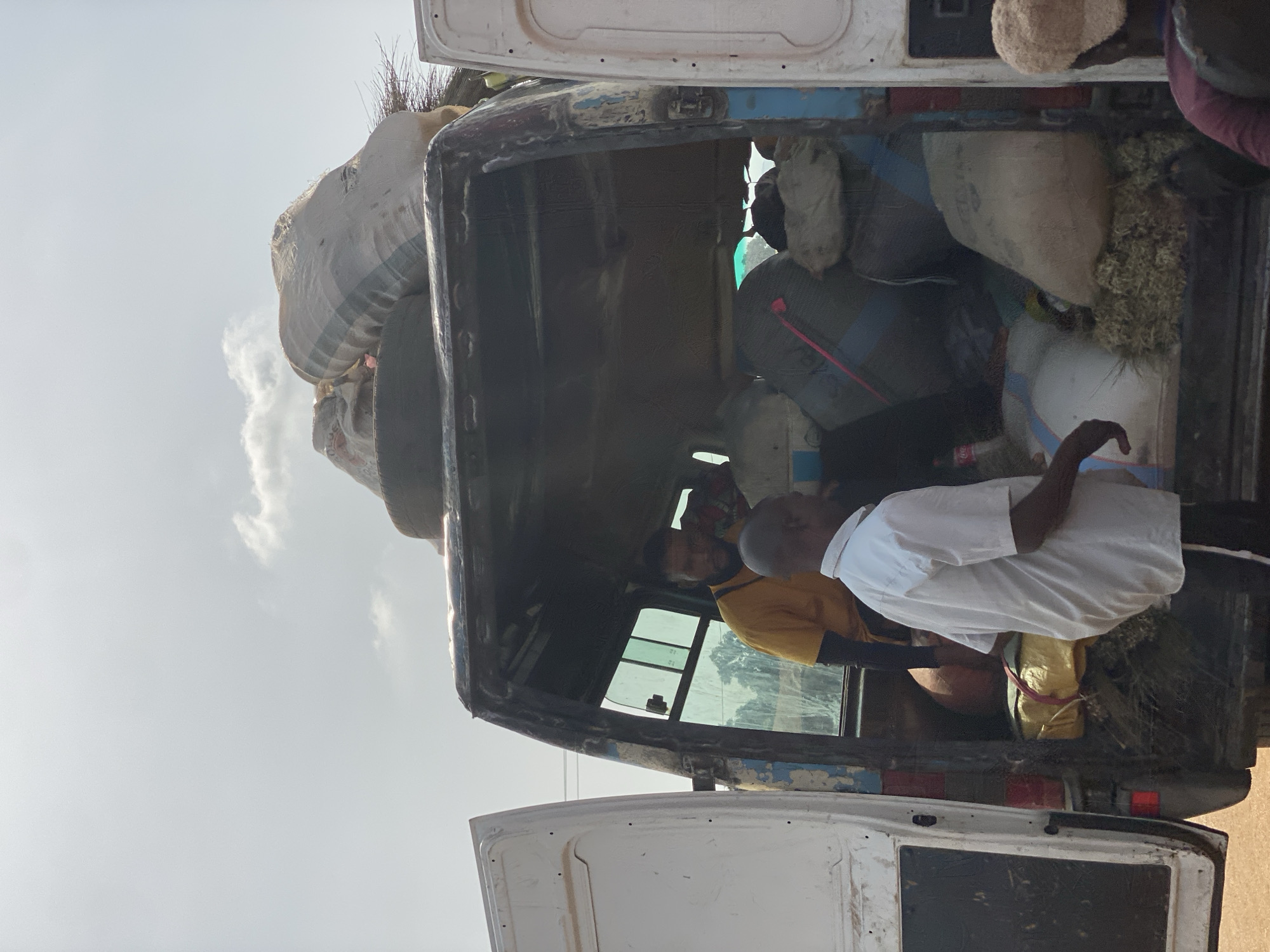 The image depicts the rear of an overloaded, open-backed truck in Kafanchan B, Nigeria. The truck bed is packed with sacks and bundles of varying sizes and materials. Two men are visible within the truck; one is wearing a yellow shirt, while the other has on a white shirt. The vehicle's door is open. The background reveals a hazy sky with a few clouds.