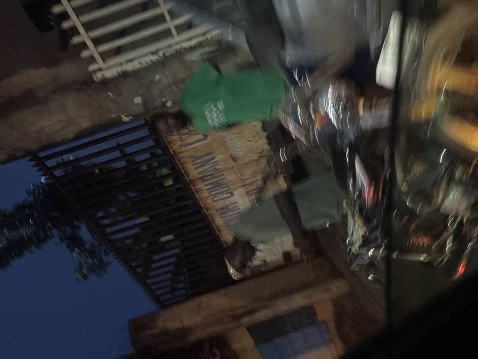 A blurry, tilted shot reveals an outdoor setting at dusk