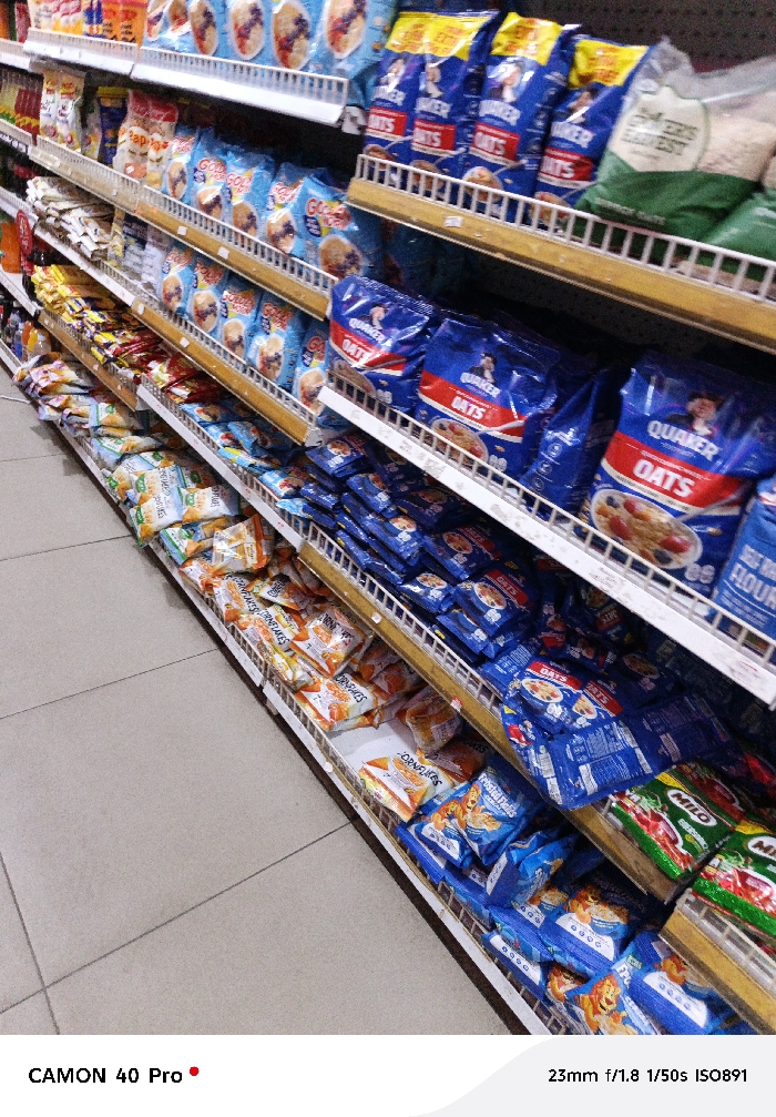A brightly lit grocery store shelf is packed with an array of breakfast cereals and flours. Top shelves feature Quaker Oats, while lower shelves are stacked with Cornflakes and Frosted Flakes. Other items like Milo are also visible. The shelves are white with wooden edges and are organized in a way that suggests variety and abundance. The tiled floor is beige. The camera setting information includes CAMON 40 Pro, 23mm f/1.8, 1/50s, and ISO891.
