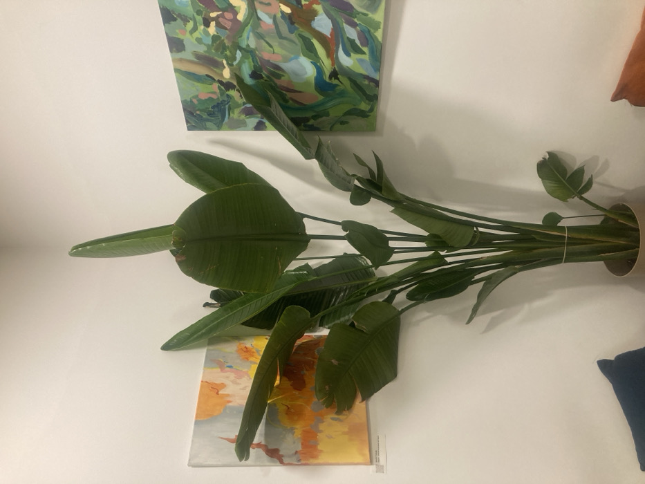 The image displays an indoor corner featuring a large potted Strelitzia (Bird of Paradise) plant