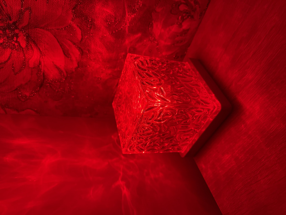 The scene depicts an interior corner in Yablonovskiy, Russia, illuminated entirely by red light. A luminous, cube-shaped object, approximately square in its base and height, sits on a wooden surface positioned in the lower-center of the frame. This object appears to be a lamp, emitting a strong red light. Its translucent sides feature an intricate, textured pattern, possibly abstract or floral, which refracts the red light. The lamp rests on a darker, solid base. The wooden surface beneath the lamp shows visible grain patterns and is washed in red light. To the immediate left of the lamp, a plain wall exhibits dynamic, wavy patterns of red light cast upon it, originating from the lamp. To the right of the lamp, a second wall is visible, covered in dark wallpaper adorned with a large, glossy floral motif that reflects the red light, creating sparkling points. The junction of these two walls forms the corner of the room. No individuals or actions are visible.