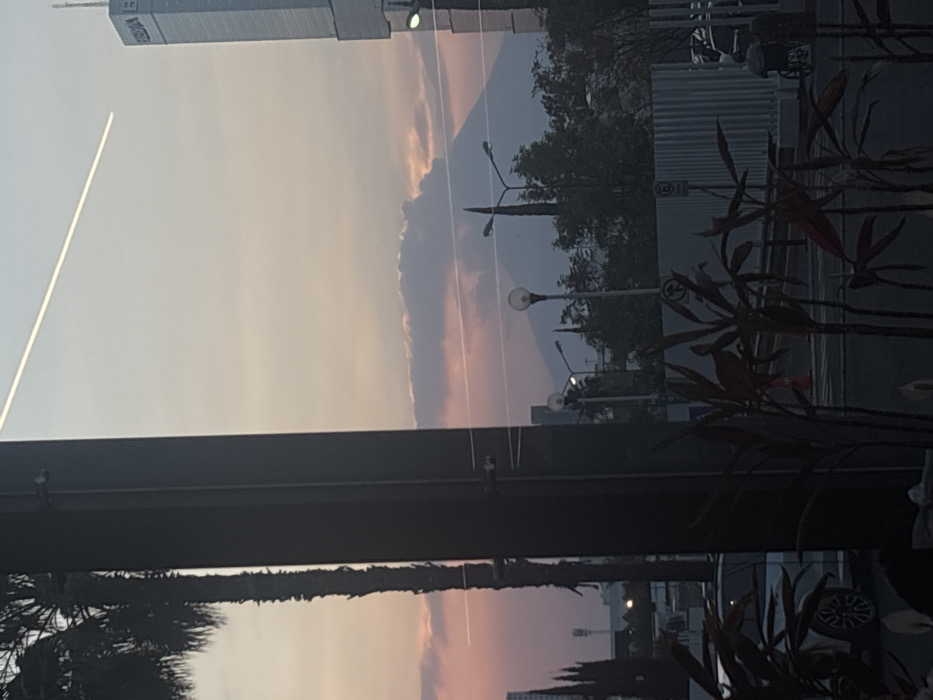 Through a reflective window, a cityscape unfolds under a dusky sky. A towering skyscraper dominates the skyline, while streetlights line a road adjacent to greenery. Reflections within the window obscure parts of the view with a silhouetted palm tree and interior framework. The colors of the sky range from pastel hues to deeper shades, evoking a serene atmosphere.