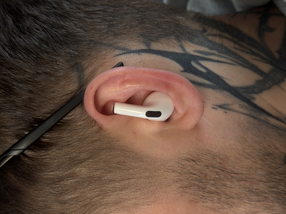 The image displays a close-up, right-side profile of an adult human head. A white Apple AirPods Pro earbud is inserted into the right ear canal, with a black sensor visible on its exterior. A pair of black-framed eyeglasses rests on top of the ear and extends backward along the head. The individual has short, dark brown hair and visible stubble on the cheek and jawline. Extensive black, abstract-patterned tattoos are present on the skin behind the ear and extending down the neck. The background is out of focus and appears to be a grey surface, possibly clothing or an interior setting. There is no discernible information within the image to identify its location in the city of Moscow, Russia.