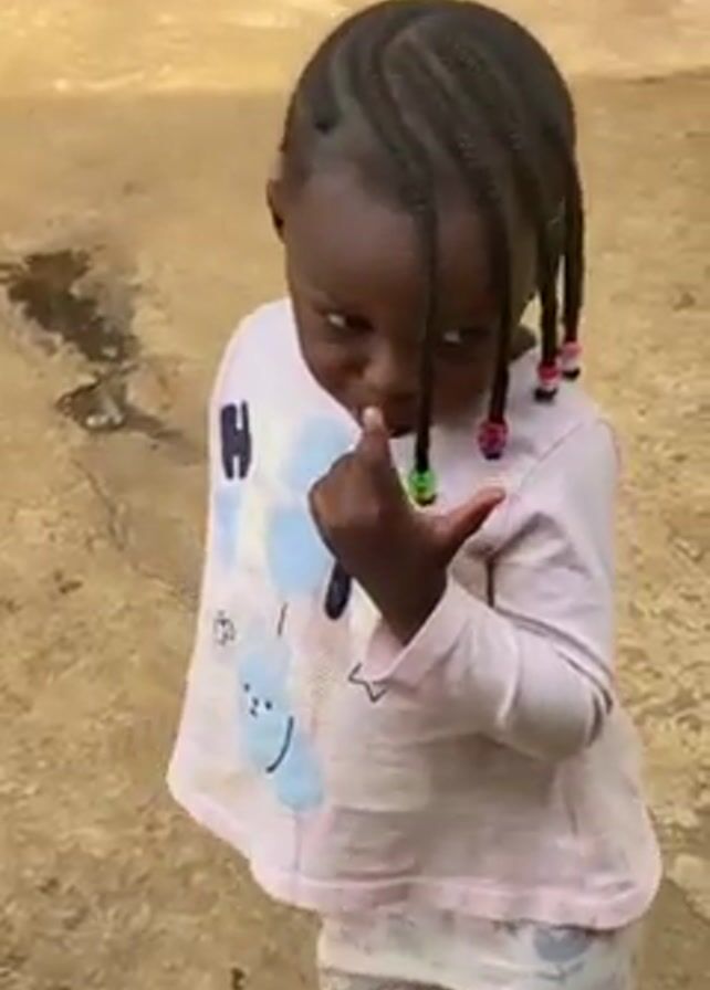 A small, dark-skinned child with short, braided hair adorned with colorful beads, wearing a pink long-sleeved shirt with a bunny print and matching patterned pajama pants, stands outdoors on a concrete surface