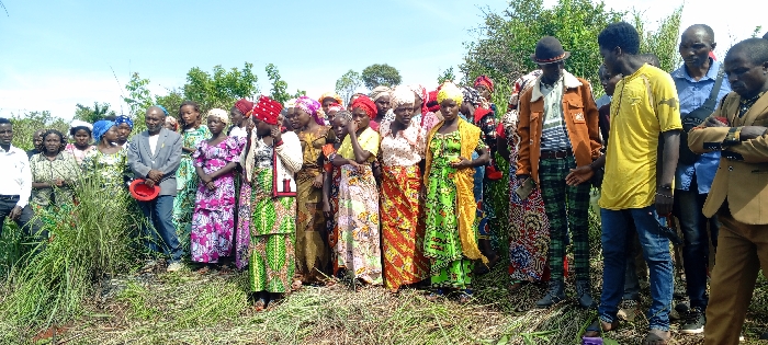 A group of approximately thirty-five to forty individuals stands outdoors in the city of Namisha, Democratic Republic of the Congo, under a clear blue sky. The scene is characterized by bright daylight. The group consists of both men and women, primarily adults. Numerous women are centrally positioned, dressed in ankle-length, brightly patterned traditional garments and headwraps in colors such as green, purple, yellow, red, and orange. Several men are visible among the group, some wearing more formal attire like suit jackets (one grey, one tan), and others in casual clothing such as t-shirts, jeans, and a brown jacket with plaid trousers. One man in a grey suit holds a red object, possibly a hat or bowl, in his left hand. Another man in a tan suit jacket has his arms crossed. A man in a yellow t-shirt and blue jeans appears to be gesturing with his right hand. The ground beneath the individuals is uneven, with patches of green grass and exposed soil. Tall green grasses and shrubs are prominent in the foreground and midground. The background features a line of dense green trees and bushes. The individuals are generally standing still, facing forward or slightly to the left, appearing to observe or listen. No explicit actions or interactions beyond standing and observing are discernable.