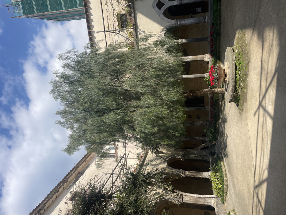 The image depicts the sunlit Cloister of San Francesco in Sorrento, Italy. A large, mature tree with slender green foliage stands centrally within an open-air courtyard. The tree's base is enclosed by a low, circular stone planter, upon which rests a terra cotta pot containing vibrant red flowers. The courtyard floor is an unpaved, light-toned surface, displaying a mosaic of direct sunlight and cast shadows. The courtyard is surrounded by a historic building featuring a series of rounded arches supported by stone columns, forming a covered walkway. The building walls are finished in a light, neutral-toned stucco, with vines and green plants growing along upper sections, partially supported by wooden trellises. In the upper right background, a tall structure covered in green scaffolding netting is partially visible against a bright blue sky dotted with scattered white clouds. No individuals or discernible actions are present within the frame.