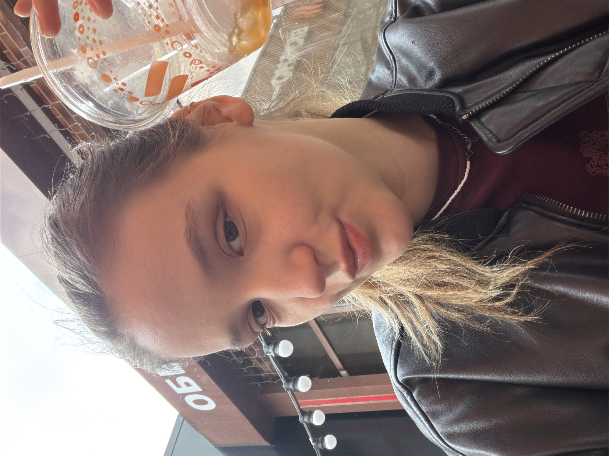 A female, likely a young adult, with a light complexion and light brown hair styled back, faces the viewer. She exhibits a subtle pout with her lips. She wears a black faux leather jacket over a dark red shirt, complemented by a thin white beaded necklace. Her right hand, partially visible, holds a clear plastic cup containing a small amount of amber liquid and ice, with a white straw inserted. The cup displays orange graphic markings. In the background, a building with a reddish-brown facade is visible. White Cyrillic letters "ОБЪ" are affixed to this facade. Below the lettering, a string of spherical white lights hangs horizontally. Brickwork is discernable further back. The sky above appears bright and overcast. The scene is located in the city of Krasnodar, Russia.