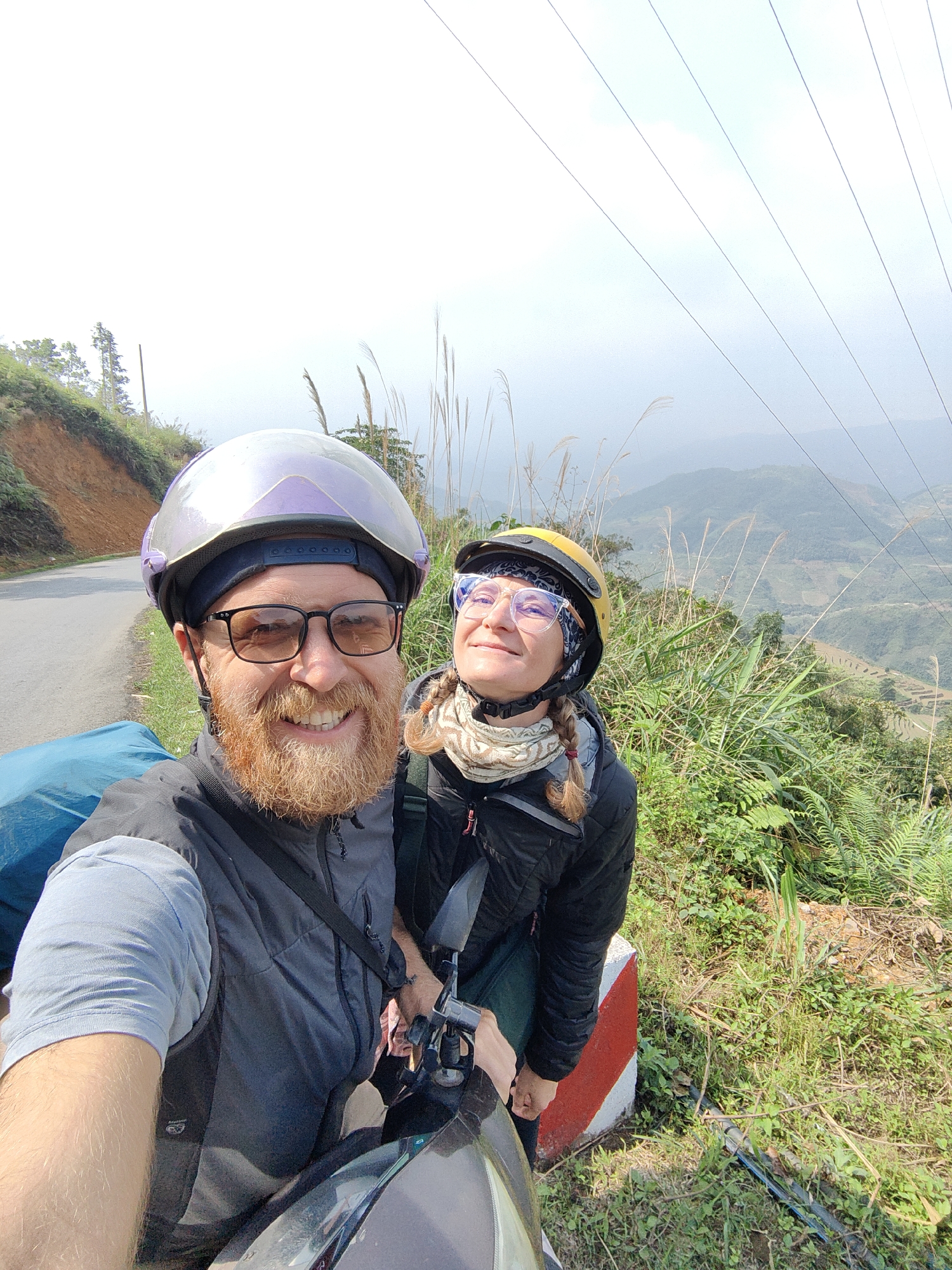 A selfie shows two people on a motorbike stopped on a road overlooking a valley, which indicates they are likely in a mountainous area