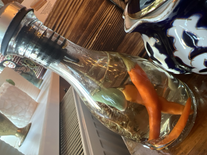 This image, reportedly taken in Bugry, Russia, depicts an indoor scene featuring a clear glass carafe. The carafe, fitted with a metallic stopper and a black rubber seal, is positioned horizontally on a wooden surface with visible grain. Inside the carafe, a light-colored liquid encases at least four whole chili peppers: three bright orange-red peppers and one green pepper, alongside dried botanical material settled at the bottom. To the upper right of the carafe, a partial view of a blue and white patterned ceramic pitcher with gold-colored trim is visible. The background to the left of the carafe includes a textured white ceramic vase, a small brass-toned goblet, and another decorative vessel with intricate patterns, all resting on a blurred white surface. Further right in the background, a white louvered fixture is partially discernible. No individuals or specific actions are observed within the frame.