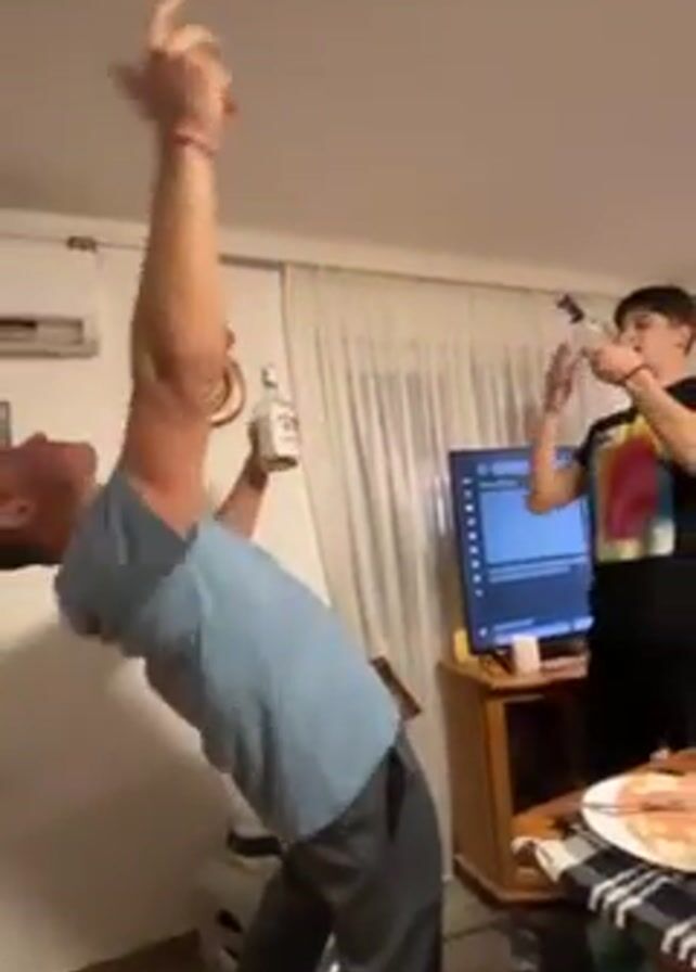 Two men are inside a living room. One in a light blue t-shirt and grey sweatpants leans backward while holding up a clear glass bottle. The other person in a black t-shirt and black jeans leans backward also while holding a phone up as if he’s recording the other person. Both men are leaning back in sync as if it’s a game or a dance. There is a table with a checkered tablecloth, a brown wooden cabinet, and a TV on the cabinet behind the two men.
