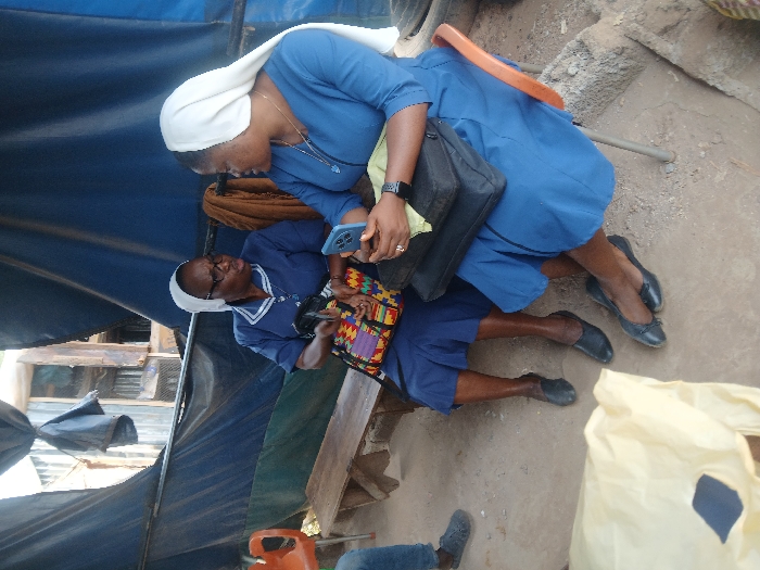 Two adult females, wearing blue dresses and white head coverings, are seated and conversing within a makeshift shelter in Nyanya, Nigeria. The woman on the left, wearing glasses, sits on a wooden bench, holding a colorful patterned shoulder bag, and appears to be speaking. The woman on the right is seated on an orange plastic chair, holding a blue smartphone and a light-colored cloth, with two black bags resting on her lap. Both women wear black flat shoes. The ground is uneven dirt. The shelter's walls and ceiling are composed of blue tarpaulin, with metallic poles visible. In the background, beyond the tarpaulin, weathered structures are partially visible. A portion of a third individual's leg, wearing blue footwear, is present on the far left.