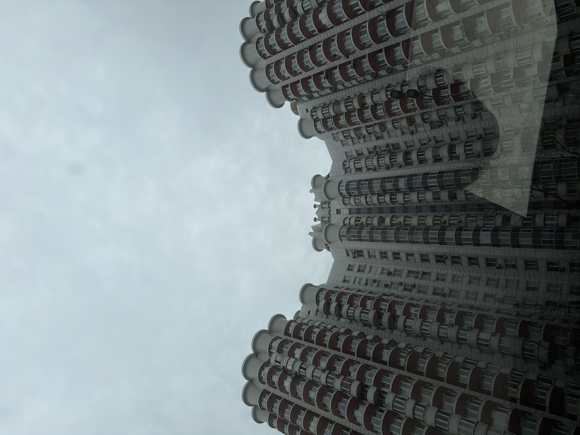 The image captures a low-angle view of the "House on Begovaya" (Dom na Begovoy), a residential building located at Chapaevsky Pereulok, 16, Moscow, Russia. The multi-story structure dominates the frame, presenting a light gray, undulating facade composed of two primary wings that converge centrally. Numerous vertically stacked, cylindrical balconies with red-brown undersides and white railings are prominent, contributing to a distinctive wave-like architectural design. Rectangular windows are visible throughout the building, with several external air conditioning units mounted beneath them. The upper section of the building features decorative, cylindrical elements along its roofline. The sky overhead is uniformly overcast and light gray, providing diffused lighting. The lower portion of the image contains a significant reflection, likely from a vehicle's windshield, which overlays the building's base. This reflection includes dark, bare tree silhouettes and a prominent angular light artifact in the lower-center. No individuals or specific activities are discernible within the scene.
