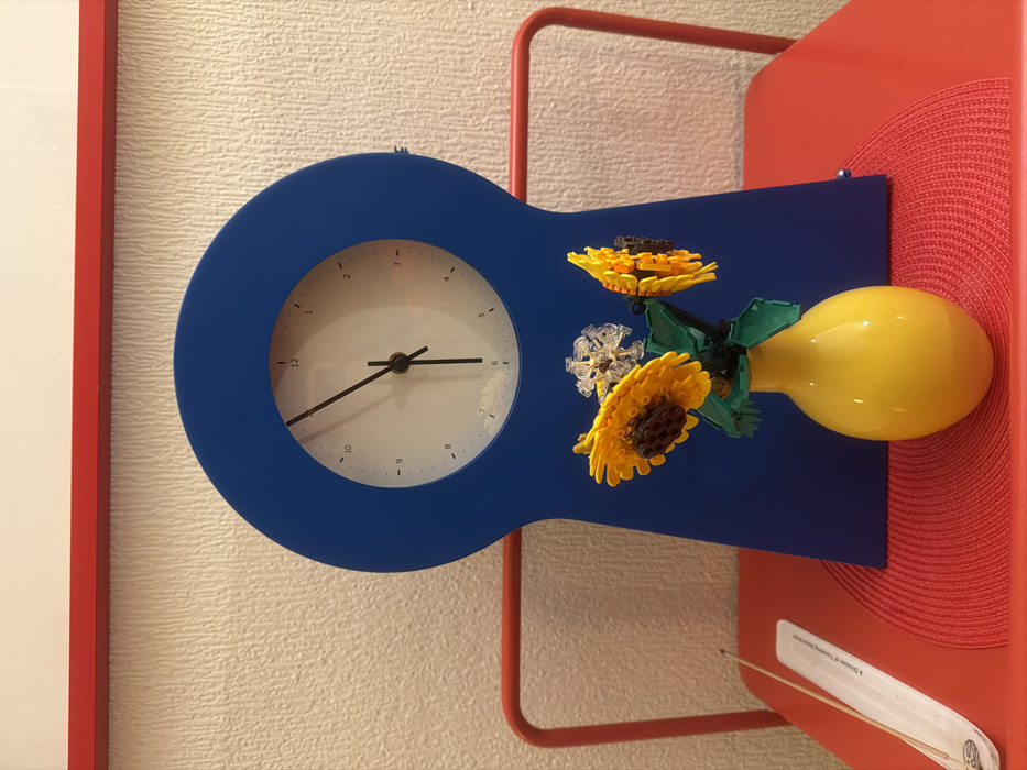 A blue wall clock with a round face and simple tick marks shows approximately 2:40. The clock is attached to a blue rectangular backing decorated with Lego-style sunflowers and a yellow light bulb. The arrangement is connected to a red frame with a round, red woven mat attached. A white sticker sits below with indiscernible text. The background features textured white walls and part of a white panel with a red frame.