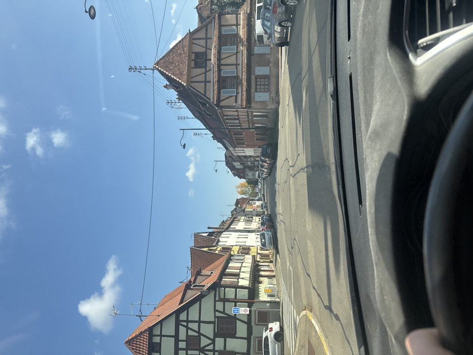 The image depicts a street scene in Sélestat, France, specifically at the intersection of Rue des Tonneliers and Rue du 17 Novembre, looking southwest along Rue du 17 Novembre. The view is captured from inside a vehicle, with a portion of a dusty black dashboard and the top of a steering wheel visible in the foreground; a left hand is partially seen gripping the steering wheel. The environment is a clear, sunny day with a bright blue sky and sparse white clouds. Shadows are cast across the paved asphalt street, which shows visible cracks. The street is lined with multiple cars parked along both sides. On the left, a prominent three-story half-timbered building with a light green stucco infill and dark timber beams features a steep red tile roof with multiple antennas. A "no parking" sign is affixed to its facade. Adjacent to this, a white Volkswagen Polo is parked next to a pedestrian crossing. A row of similar multi-story Alsatian-style houses, varying in facade color, extends down the street. On the right, another large three-story half-timbered building, with beige/light brown stucco and dark timber beams, also has a steep red tile roof and utility wires overhead. Its ground floor windows are equipped with light blue shutters. Several vehicles, including a grey Audi sedan and a white van, are parked along this side of the street. Dark-poled streetlights are visible extending into the distance on both sides of the road. Further down the street, some trees display yellowing foliage, suggesting an autumn season. No people are visible within the frame.
