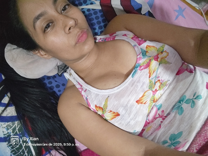The scene is an interior shot depicting a single individual in a private residence, identified as being in the city of Cali, Colombia. An adult female is positioned lying down on a bed, facing the camera. She has long, dark hair visible on the left side of her head and extending behind her. Her skin tone is light-to-medium. Her eyes are open, and her lips are slightly pursed. She wears a white sleeveless top (tank top) adorned with a multi-colored floral pattern in shades of pink, orange, yellow, green, and light blue. The bedding consists of a light-colored pillow under her head. Visible textiles include a blue sheet with a light blue dotted or circular pattern to her left, and a pink sheet with white star patterns to her upper right. Additional patterned fabrics, including a darker red/maroon and a reddish-pink material, are also present. A digital watermark "By Xian" and the timestamp "3 de noviembre de 2025, 5:59 p. m." are overlaid in the bottom-left corner of the image.