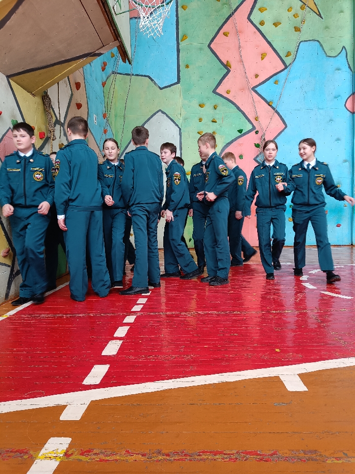 The scene depicts approximately twelve adolescents within an indoor facility, likely a gymnasium or training center, located in Sarapul, Russia