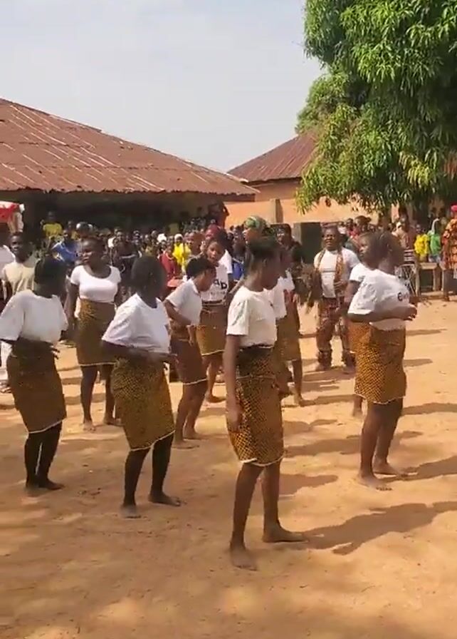 group of young people, mostly women, performing a dance in an outdoor setting. They are all dressed in white tops and printed yellow and brown skirts. They stand barefoot on a sandy, dirt-covered ground. Behind them, a crowd of people watches from under a large, white and red tent. There is a cluster of low buildings with rusted roofs and a large tree to the right. The day is bright, with a partly cloudy sky. The camera remains relatively static, capturing the dance performance.