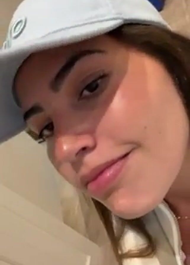 A close-up shot shows a light-skinned woman wearing a light blue baseball cap with a small design on the front
