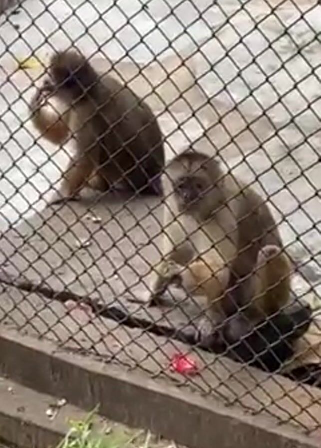 Two monkeys are sitting behind a chain-link fence. The monkey on the left is eating something. The monkey on the right is holding something in its hands. There are pieces of red litter on the ground. There is green vegetation behind the fence in the bottom left. A crack is visible in the concrete floor.