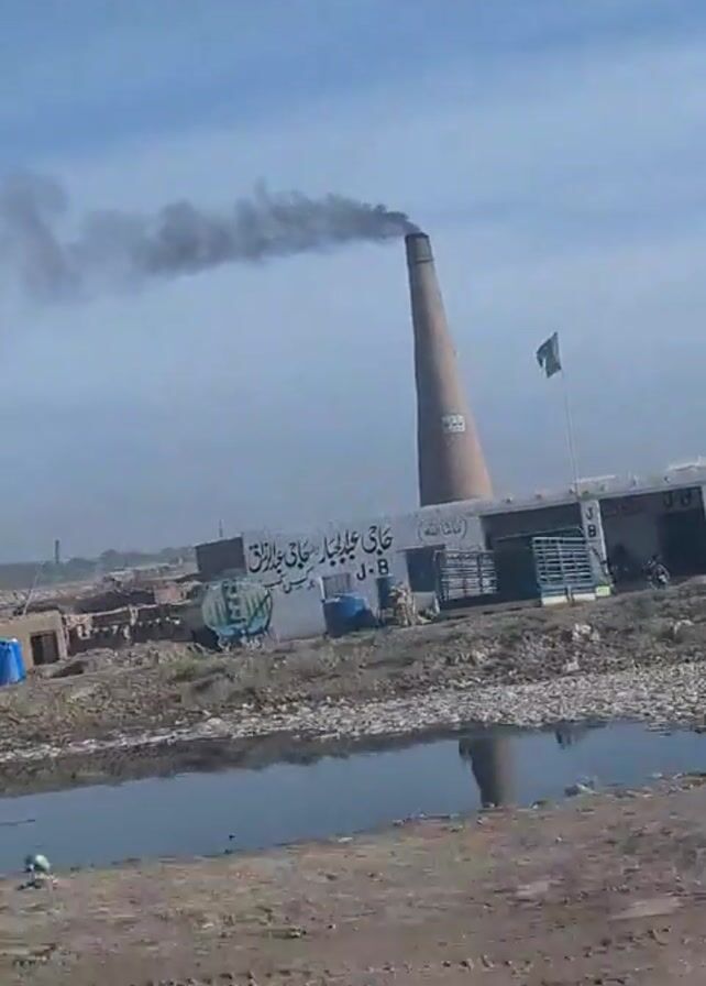 brick kiln in a rural area, likely in South Asia. A tall chimney is emitting a plume of black smoke, indicating active burning. The surrounding landscape is dusty and arid, with stacks of bricks visible in various stages of production. Buildings associated with the brick making operation are present. One man is visible, standing beside a stack of bricks. The video is filmed from a moving vehicle. There are also walls with writing in Urdu.
