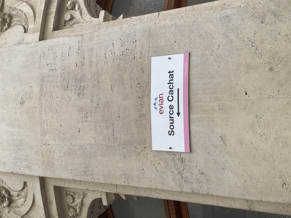 A white rectangular directional sign, measuring approximately 40cm by 20cm, is affixed to a vertically oriented, light-beige stone column. The stone exhibits a porous texture with visible horizontal striations, consistent with travertine. Decorative carved stone elements featuring floral or scroll patterns are visible on the left and right edges of the column, partially obscuring dark, recessed window or archway openings. The sign features the "evian." brand logo in blue and red at the top. Below the logo, the text "Source Cachat" is printed in black, accompanied by a solid black arrow pointing left. In the bottom right corner of the sign, the phrase "Live young." is inscribed in small, black lettering. A thin pink band borders the entire bottom edge of the sign. The sign is secured to the column by two visible dark fasteners, positioned on the left and right sides. No individuals are present in the frame. The scene is located in the city of Évian-les-Bains, France, providing direction to the historic Source Cachat.