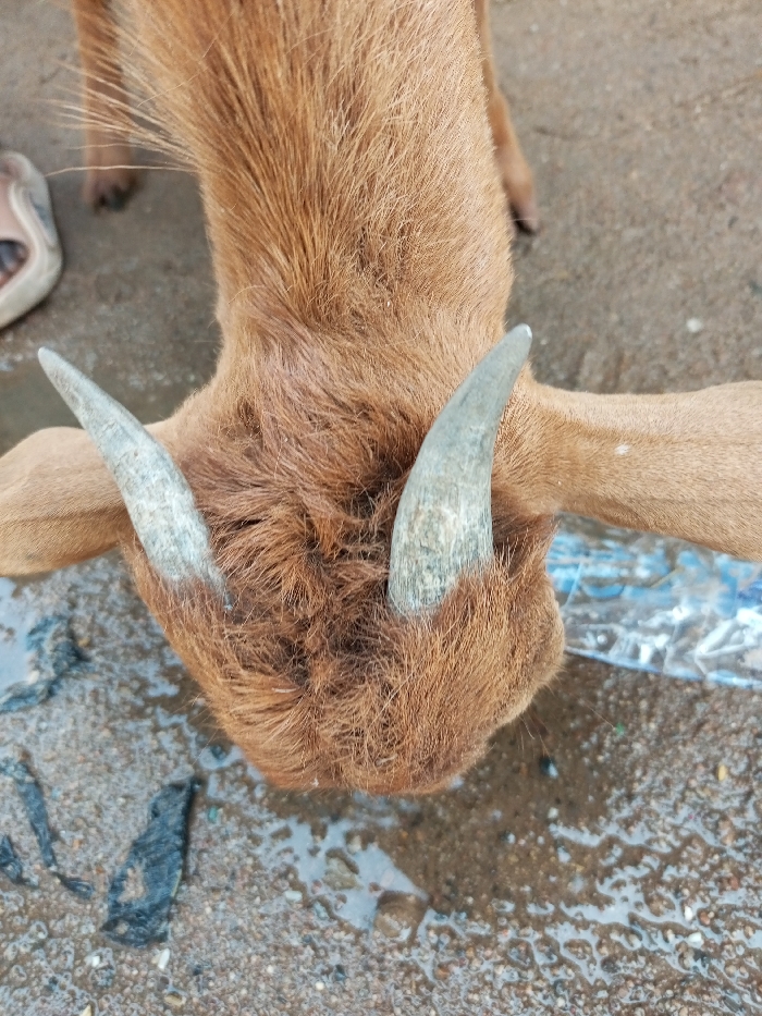 - "The image displays a brown-furred caprine animal, identified as a goat, with its head lowered towards a wet ground surface in Pantame, Nigeria" by FM-l9iEo2, licensed under CC BY 4.0