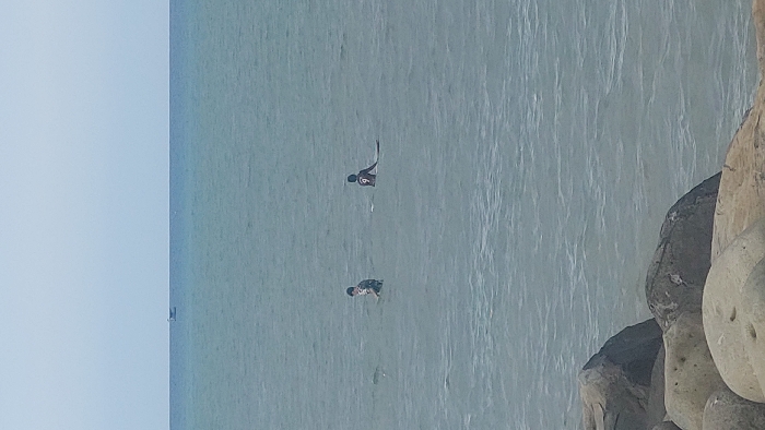 The image depicts a daytime coastal scene in Lhokseumawe, Indonesia. In the foreground, multiple rounded rocks, varying in shades of light grey and beige, are visible. The midground features a body of choppy, grey-blue water. Two individuals are present in the water. The person on the left is standing waist-deep, wearing a patterned light-colored top and dark bottoms. The second individual, positioned further to the right, is seated on a white surfboard, facing away from the viewer, wearing a dark top with a prominent white number '9' on the back. Both individuals are partially submerged in the water. In the distant background, a small, light-colored boat is visible on the horizon line against a pale blue sky.