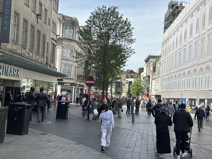 street scene in Liverpool, UK, at coordinates 53.405, -2.983. It is a bustling urban street lined with shops, including a Primark store on the left and a Lush store on the right. The street is paved with gray concrete and has a pedestrian crossing in the middle. There are many people walking on the sidewalk and crossing the street, all of them wearing street clothes. Some of them are carrying bags or shopping bags. There is a large tree in the middle of the street with a stop sign attached to a pole next to it. The street is flanked by buildings, with a tall one on the right covered in scaffolding. The buildings have many windows, some of which are boarded up. The sky is bright blue with some clouds. The scene is typical of a busy city center during the day.