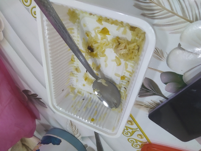 An indoor scene in Tashkent, Uzbekistan, displays a white rectangular plastic container resting on a white tablecloth with a gray and gold leaf pattern. The container holds remnants of yellow pilaf and a silver-colored metal spoon. To the immediate left of the container, a dark-colored smartphone lies face down. Further left, a portion of an orange object is visible. To the upper right, a blue and white patterned ceramic cup or bowl is partially visible, alongside a crinkled pink item, possibly a napkin or bag. The arrangement suggests a recently concluded meal. No individuals are present.